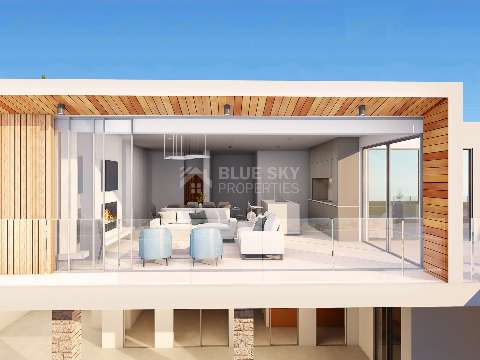 An upper level hosting three spacious, light-filled bedrooms, all with en-suite bathrooms. The master suite features a walk-in wardrobe and a private covered veranda with panoramic sea views.