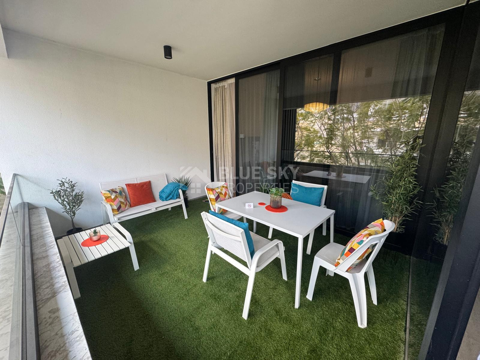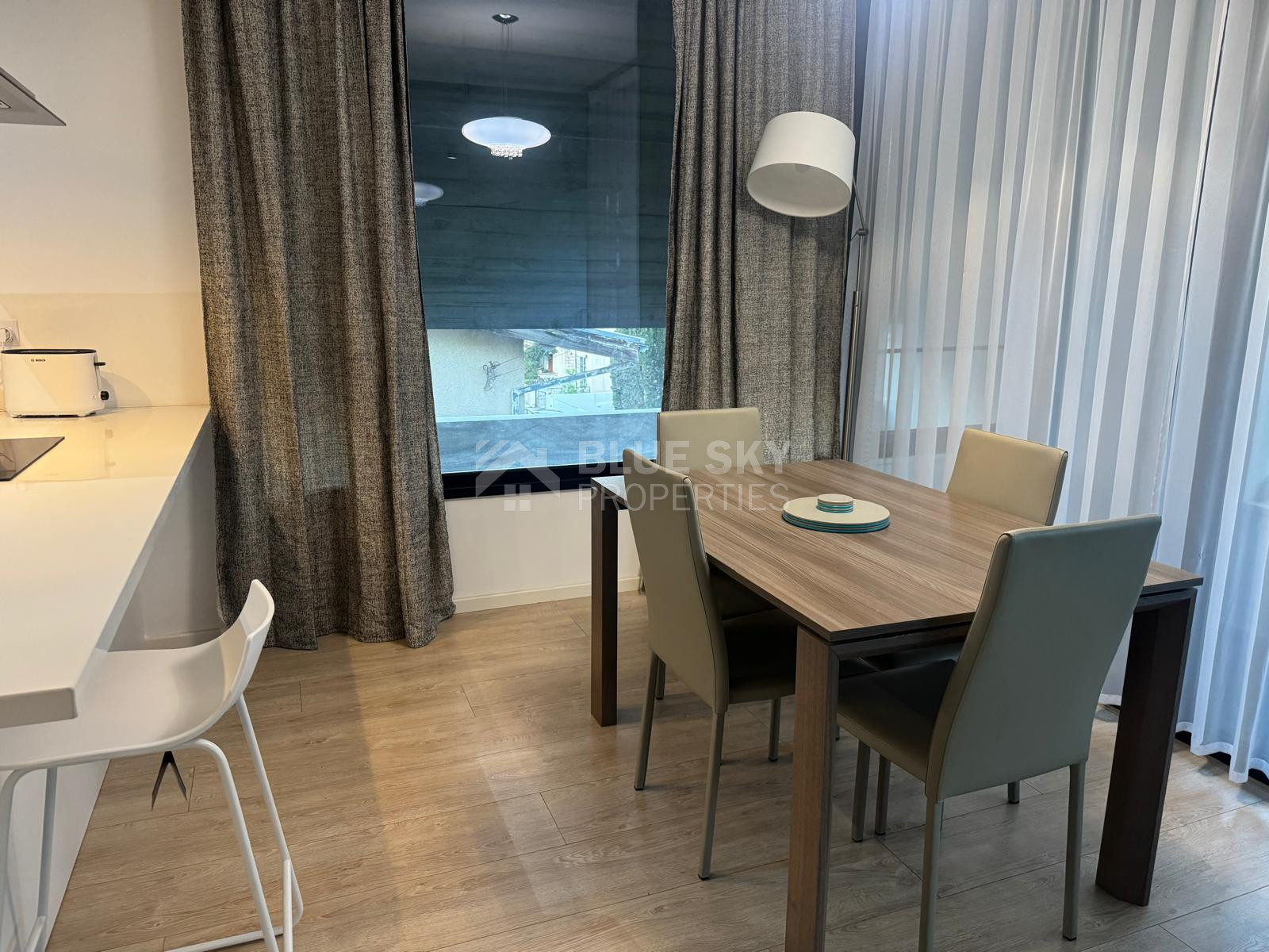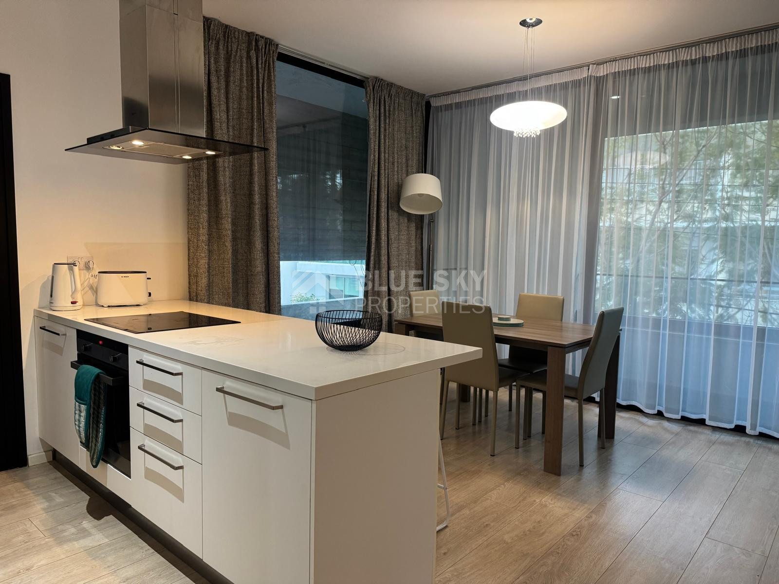 The apartment features a thoughtfully designed open-plan layout, combining a stylish kitchen, dining, and living area that flows seamlessly onto a beautifully furnished balcony—ideal for relaxing or entertaining. The kitchen is fully equipped with high-end electrical appliances, including a dishwasher, washing machine, and fridge freezer, complemented by a sleek island bar.