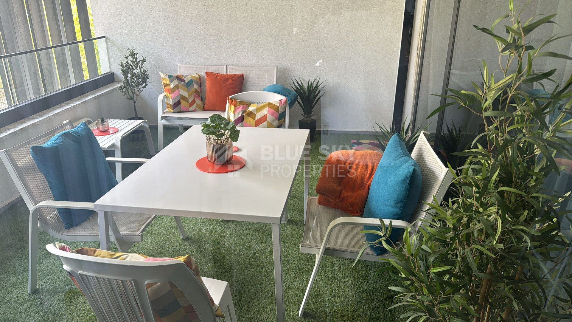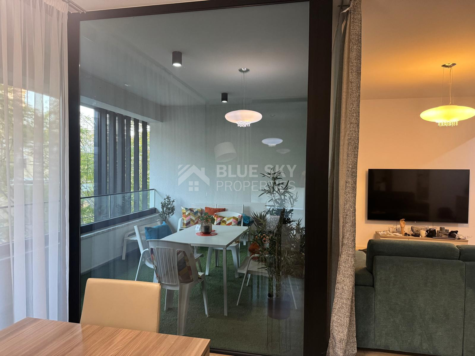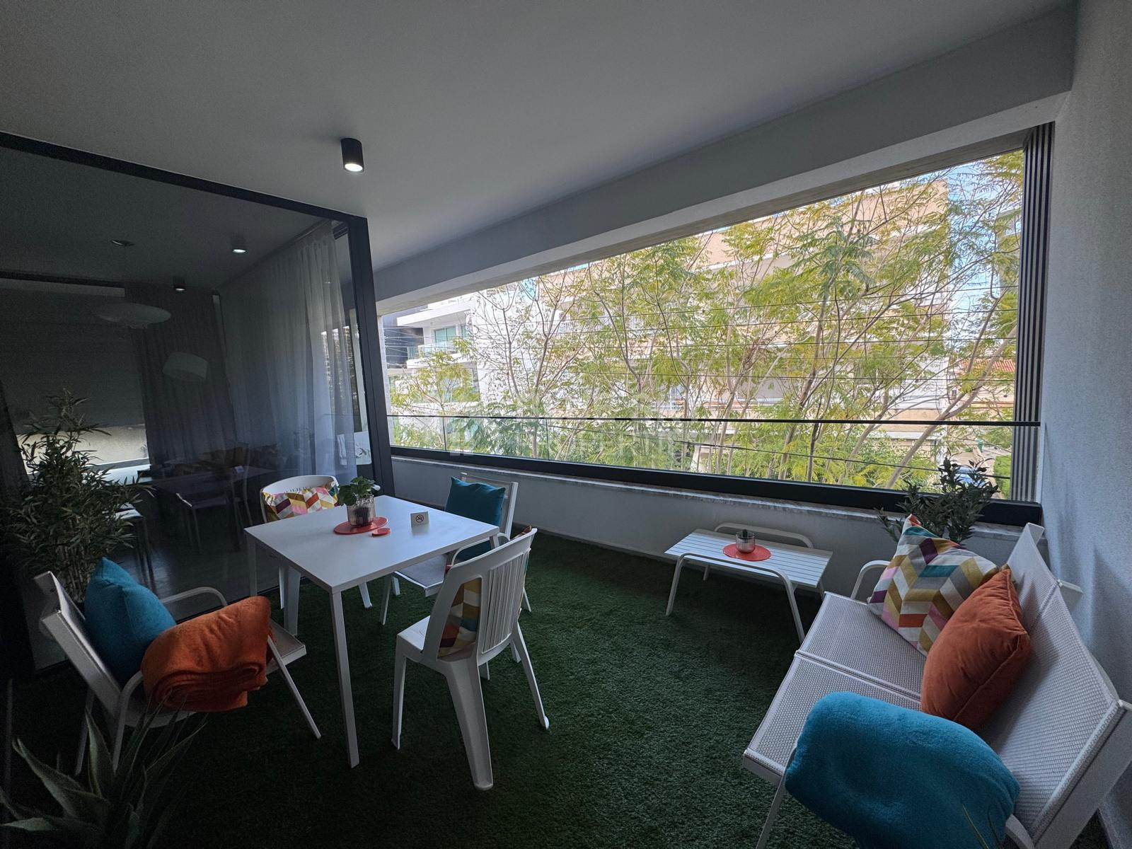 The apartment features a thoughtfully designed open-plan layout, combining a stylish kitchen, dining, and living area that flows seamlessly onto a beautifully furnished balcony—ideal for relaxing or entertaining. The kitchen is fully equipped with high-end electrical appliances, including a dishwasher, washing machine, and fridge freezer, complemented by a sleek island bar.