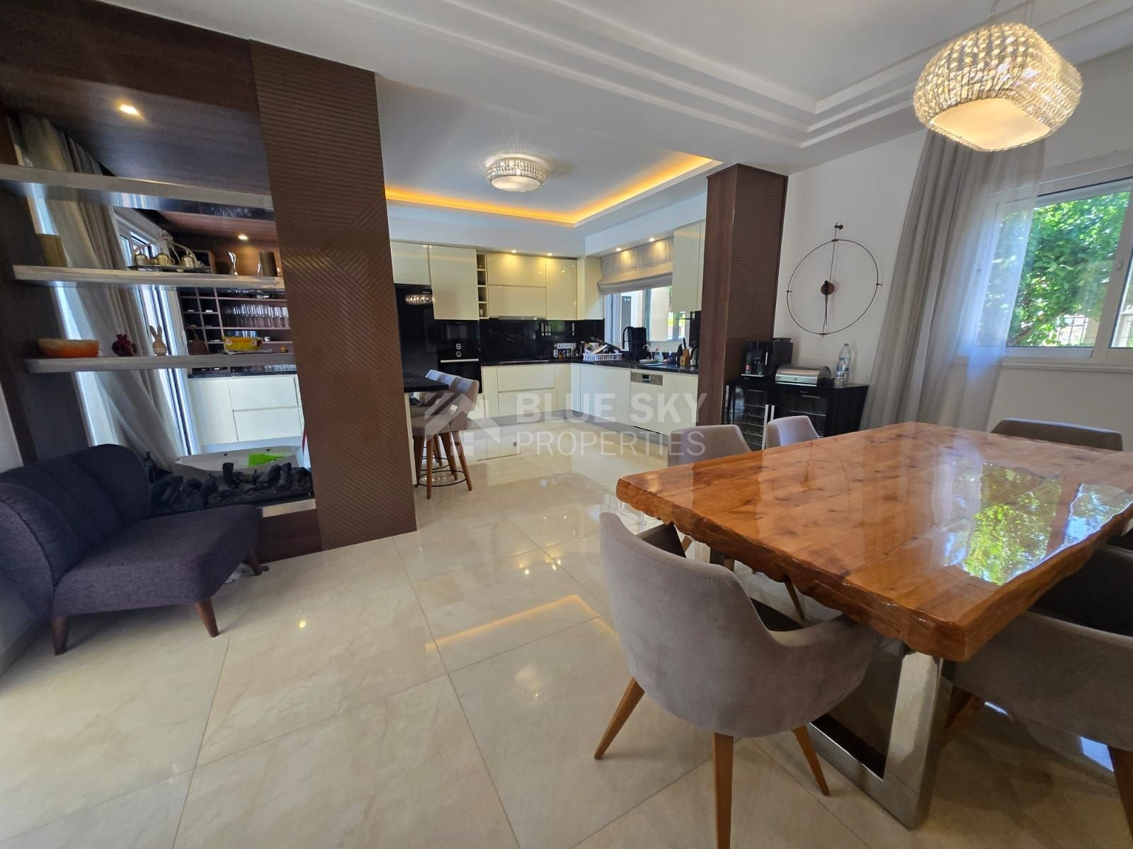 Open-plan layout: Elegant interior with a seamless flow between living, dining, and kitchen areas, featuring a cozy fireplace