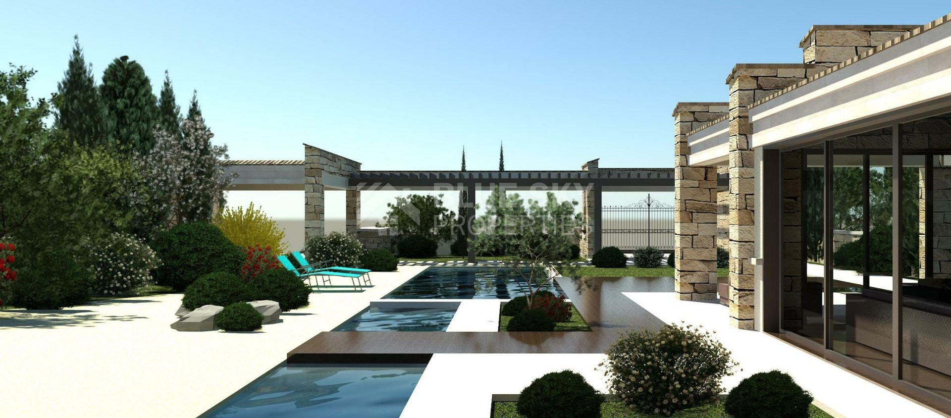 Designed in a contemporary Mediterranean style, the villa blends stone-clad facades, timber details, and clay-tiled roofs with modern open-plan living spaces. It offers a spacious internal covered area of approximately 225 square meters, with additional covered verandas and ancillary spaces that bring the total covered area to around 306 square meters. The property sits on a generous 1,134 square meter plot, featuring beautifully landscaped gardens, a private swimming pool, and ample outdoor entertaining areas.